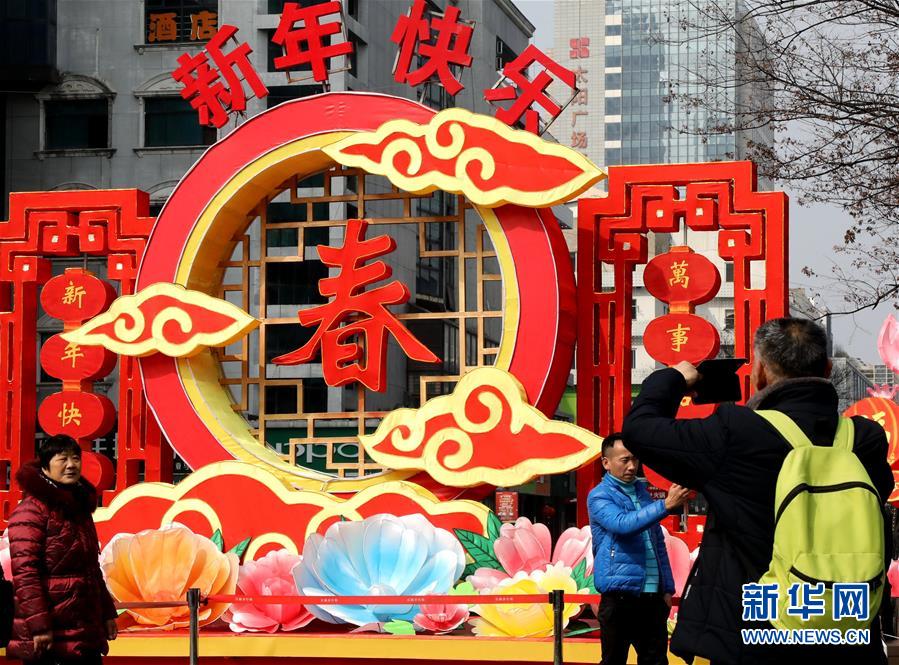 2月4日,市民在江苏苏州街头的新春灯饰前留影。 当日是除夕,各地张灯结彩,喜气洋洋。 新华社发(杭兴微 摄)