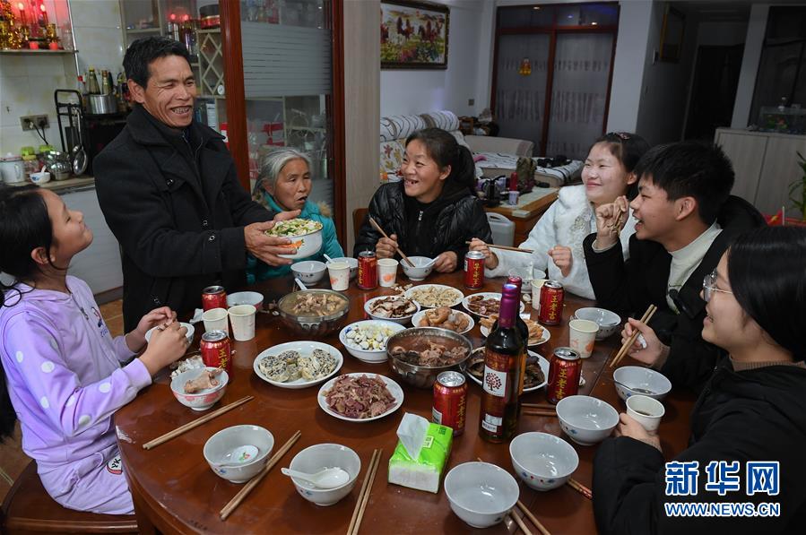 2月4日,建瓯市东游镇渡潭村建档立卡户黄旺财(左二)一家在新居吃年夜饭。