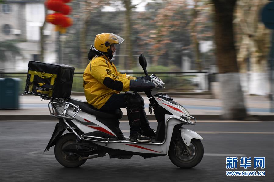 2月4日,丁鸿在长沙街头送餐。新华社记者 薛宇舸 摄
