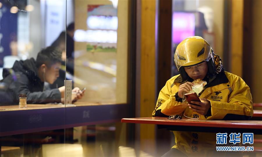 1月27日晚,送餐的间隙,丁鸿在一家餐厅外一边啃面包一边看手机。 新华社记者 李尕 摄