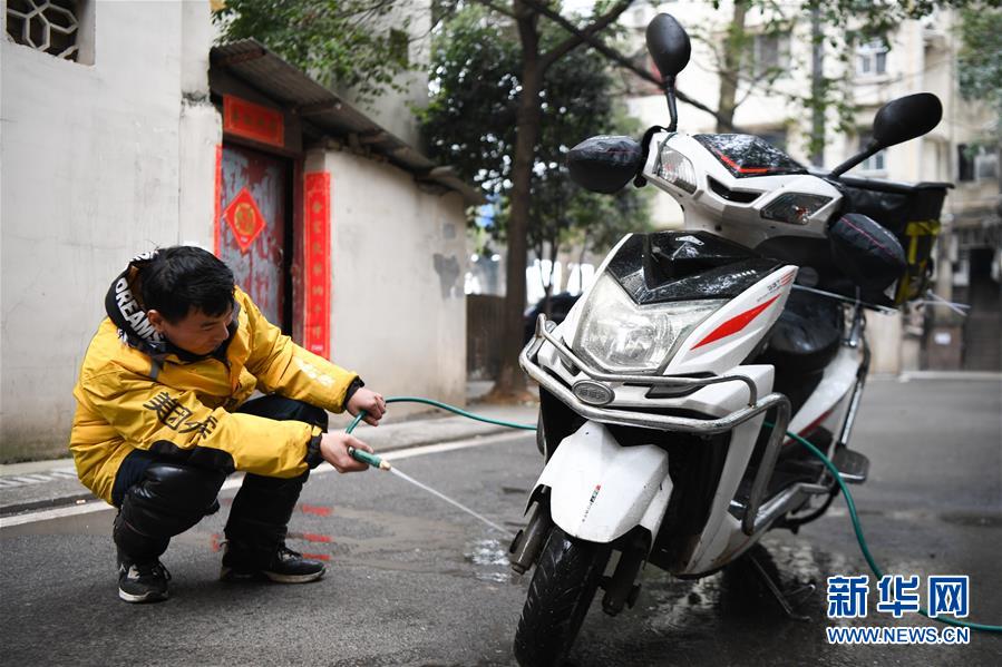 2月4日下午下班后,丁鸿在清洗电动车。新华社记者 薛宇舸 摄