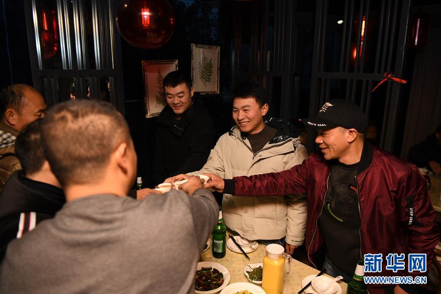 2月4日晚,下班后的丁鸿(右二)和同事们一起来到饭馆聚餐,这是属于他们的年夜饭。 新华社记者 薛宇舸 摄