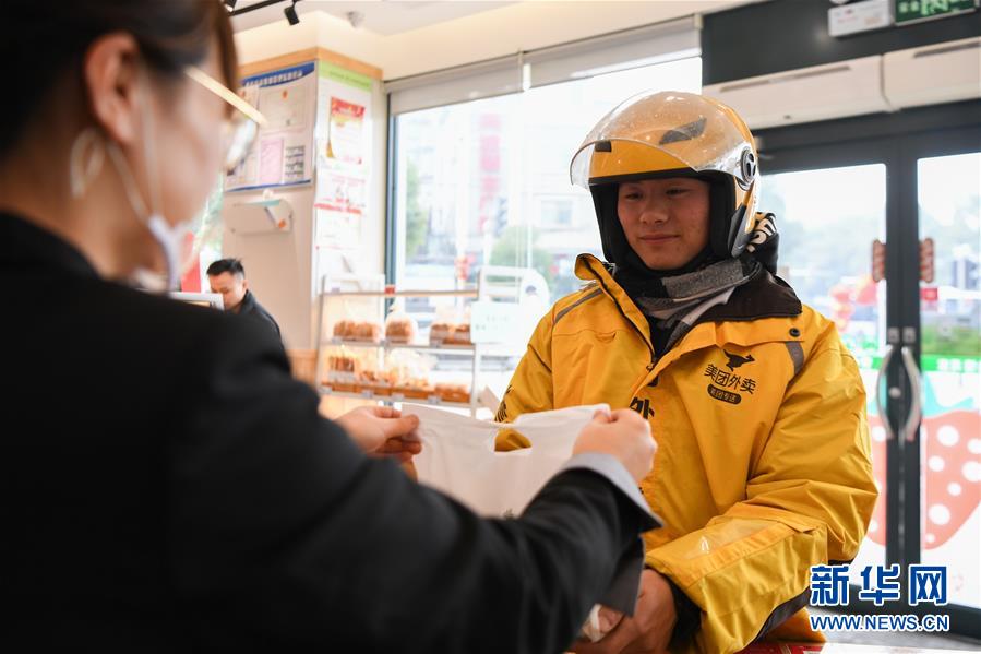 2月4日,丁鸿从商家手中取餐。 新华社记者 薛宇舸 摄