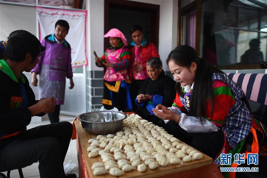 2月4日,松德村五社村民李玉花(右一)和家人一同包饺子。 当日是除夕,青海省海东市互助土族自治县丹麻镇松德村五社的40户村民在新居中喜迎新春。2018年,这40户村民通过易地扶贫搬迁政策住进新房并顺利实现脱贫。 新华社记者 张宏祥 摄