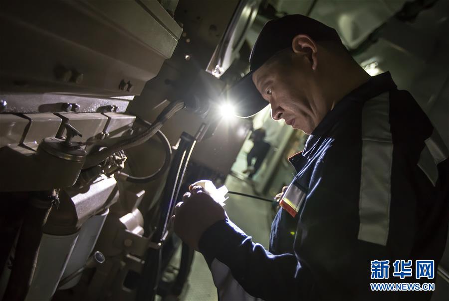 1月31日,在肯尼亚首都内罗毕,负责维护保养的“火车医生”团队成员徐向扬检查柴油发电机的机油标尺。
