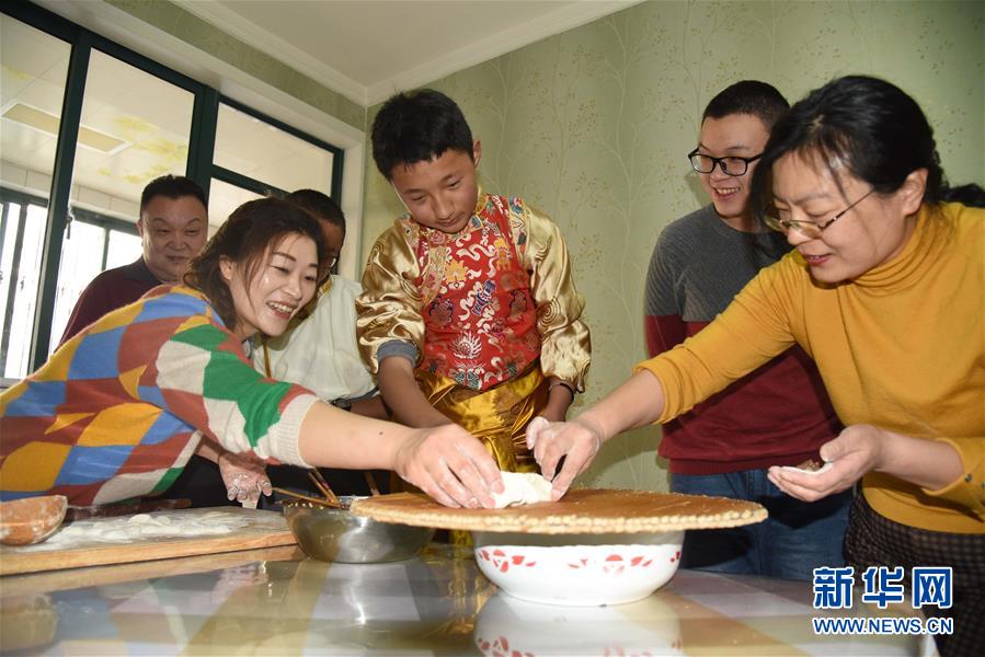 2月4日,炜典(右三)在小伙伴李天润(右二)家中学习包饺子。 当日,山东省济南西藏中学的藏族学生炜典和贵桑格列来到他们的结对小伙伴李天润家里,和李天润及家人一起度过一个别样的除夕。 新华社记者 王凯 摄
