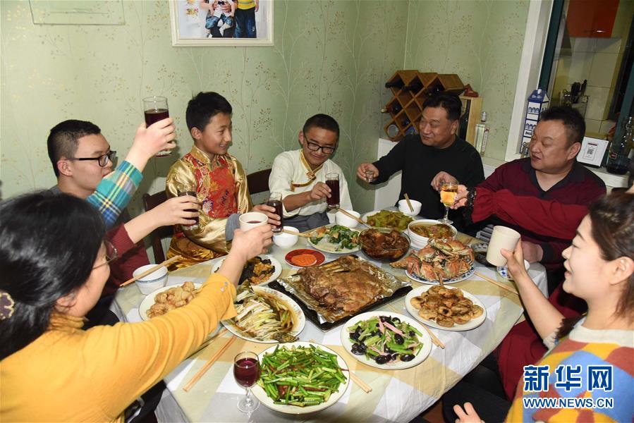 2月4日,贵桑格列(左四)、炜典(左三)和对口家庭李天润(左二)一家举杯庆祝除夕佳节。 当日,山东省济南西藏中学的藏族学生炜典和贵桑格列来到他们的结对小伙伴李天润家里,和李天润及家人一起度过一个别样的除夕。 新华社记者 王凯 摄