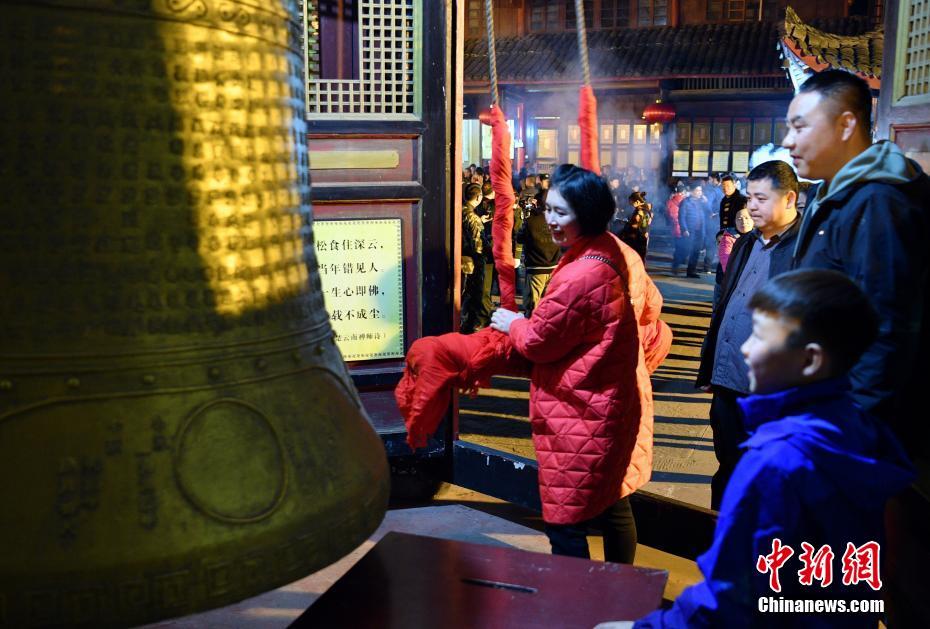 2月5日,农历正月初一,万余民众汇聚四川峨眉山报国寺撞钟祈福。中新社记者 刘忠俊 摄