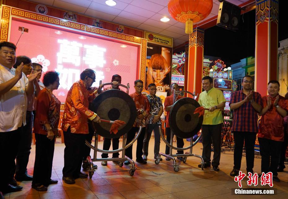 2月4日除夕夜,马来西亚马六甲各族裔民众和外国游客齐聚世界文化遗产马六甲古城区的核心街区鸡场街,在倒计时中共迎华人新春佳节。图为马六甲州行政议员郑国球(右三)和马六甲鸡场街工委会主席颜文龙(前排左三)在农历新年到来之际共同鸣锣。中新社记者 陈悦 摄