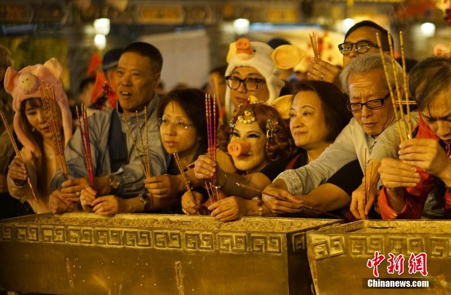 2月4日除夕夜子时,香港黄大仙祠人头攒动,众多善男信女争上头炷香,为即将到来的新年祈福。图为戴着猪面具的香港艺人黃夏蕙(中)十多年来坚持在除夕夜子时抢头香。中新社记者 张炜 摄