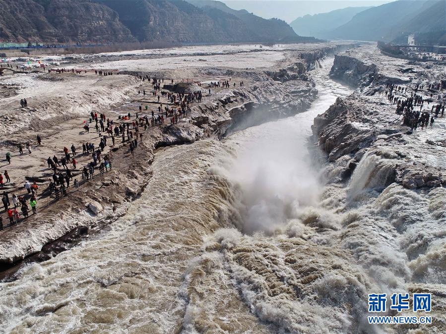 2月5日,游人在黄河壶口瀑布景区观赏瀑布(无人机拍摄)。 新华社发(薛俊 摄)
