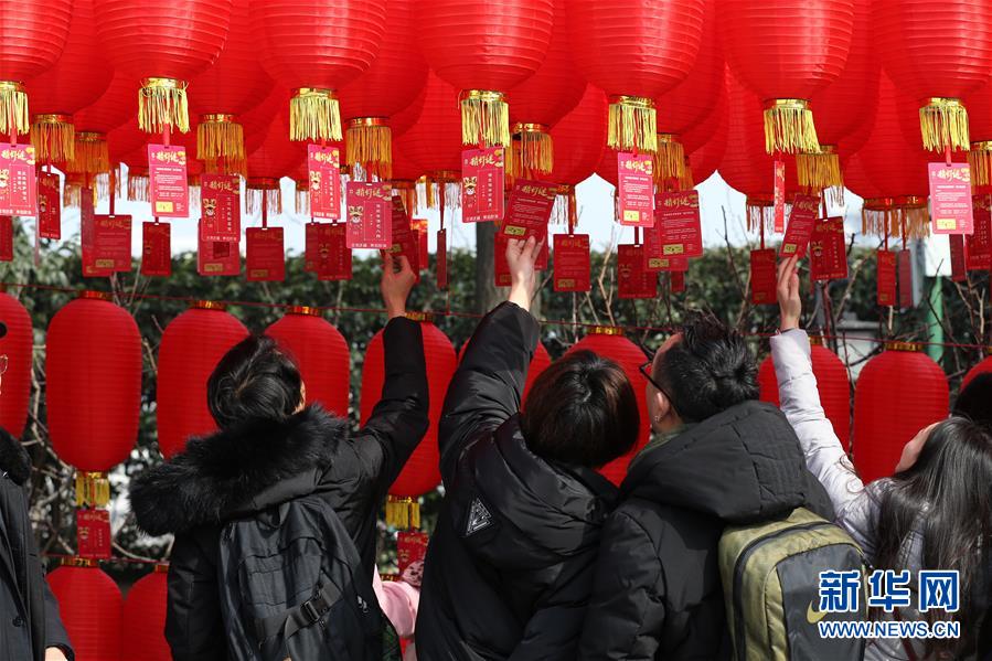 2月5日,游人在武汉黄鹤楼公园参加猜灯谜活动。 新华社发(周国强 摄)