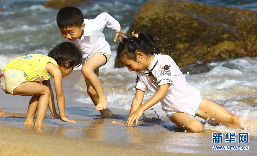 2月5日,小朋友在家长的看护下在海南三亚南山景区戏水玩耍。 新华社发(陈文武 摄)