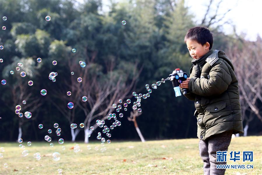 2月5日,一名小朋友在安徽淮北市相山公园吹泡泡。 新华社发(万善朝 摄)