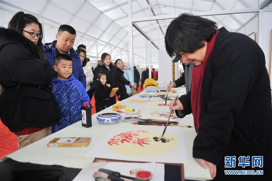 2月5日,在山东青岛金沙滩啤酒城,书画家现场为市民作画。 新华社发(于少月 摄)