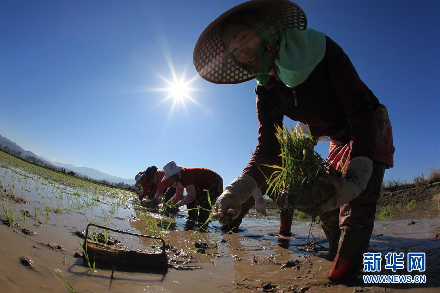 2月5日,在云南西双版纳傣族自治州勐海县勐混镇,农民在抢抓时令栽插早稻。 新华社发(李云生 摄)