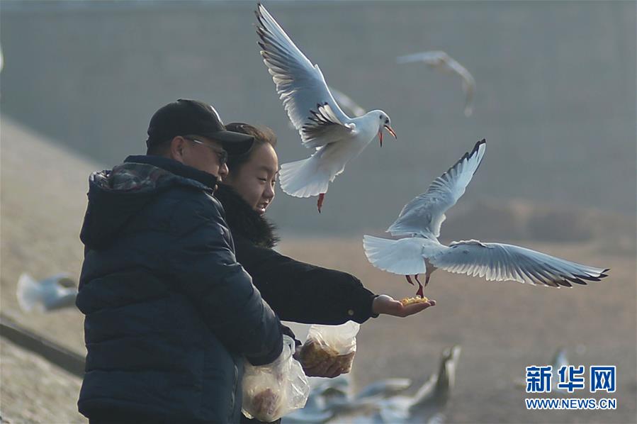 2月5日,游客在山东青岛栈桥景区与海鸥互动。 新华社发(王海滨 摄)