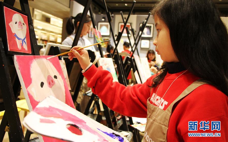 2月5日,一名小朋友在苏州一家美术书店画卡通猪。 新华社发(朱桂根 摄)
