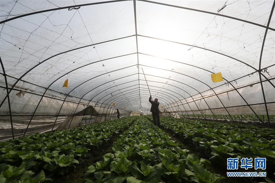 2月5日,在重庆黔江区舟白街道县坝社区保供蔬菜基地,村民廖大刚(右)和妻子程文在整理蔬菜大棚。 新华社发(杨敏 摄)