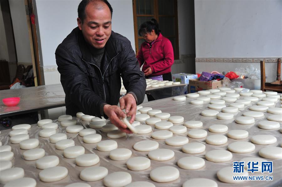 2月5日,在广西河池罗城仫佬族自治县凤凰社区,村民在翻晒自家制作的糍粑。 新华社发(吴耀荣 摄)
