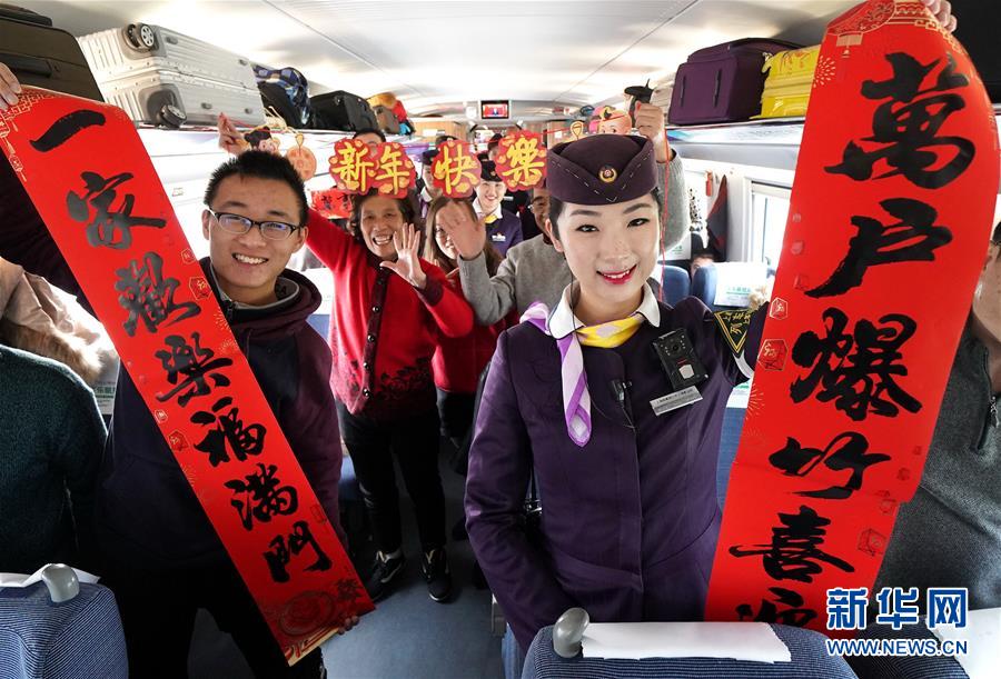 2月5日,G360次高铁乘务员和旅客在车厢内互动合影。