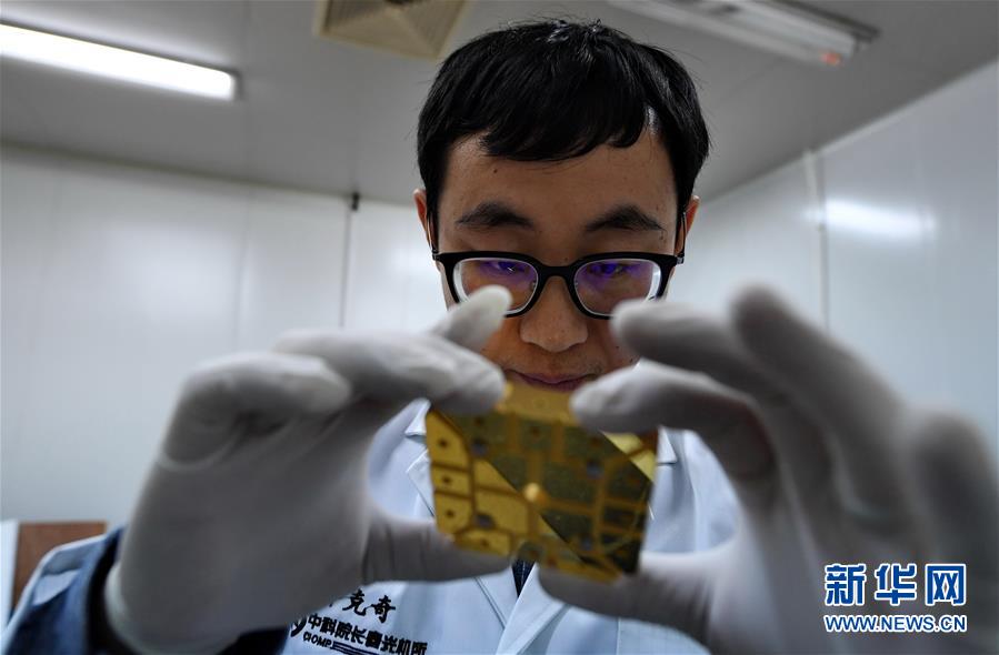 2月4日晚,在中科院长春光机所,科研人员齐克奇检验卫星载荷的零部件。 新华社记者张楠摄