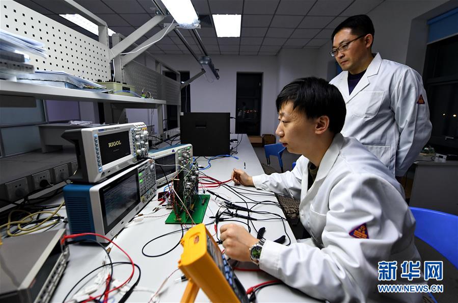 2月4日晚,在中科院长春光机所,科研人员隋延林(前)和于涛调试卫星载荷电控箱电路。 新华社记者张楠摄