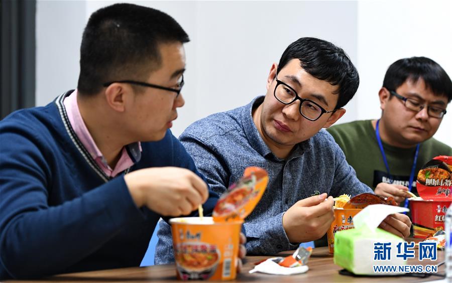 2月4日晚,在中科院长春光机所,科研人员沙巍、齐克奇和王少鑫(从左至右)边吃泡面边商量工作。 新华社记者张楠摄