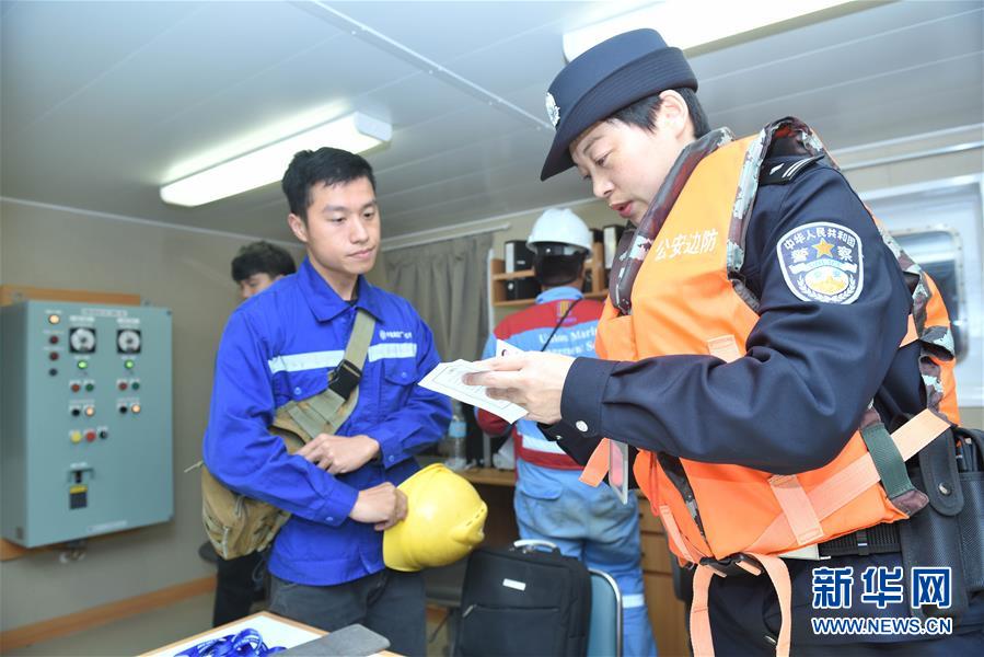 2月4日,广西北海出入境边检站工作人员邵金玲(右一)和同事在北海港石步岭码头的货轮上进行安全检查巡视。 新华社发(李君光 摄)