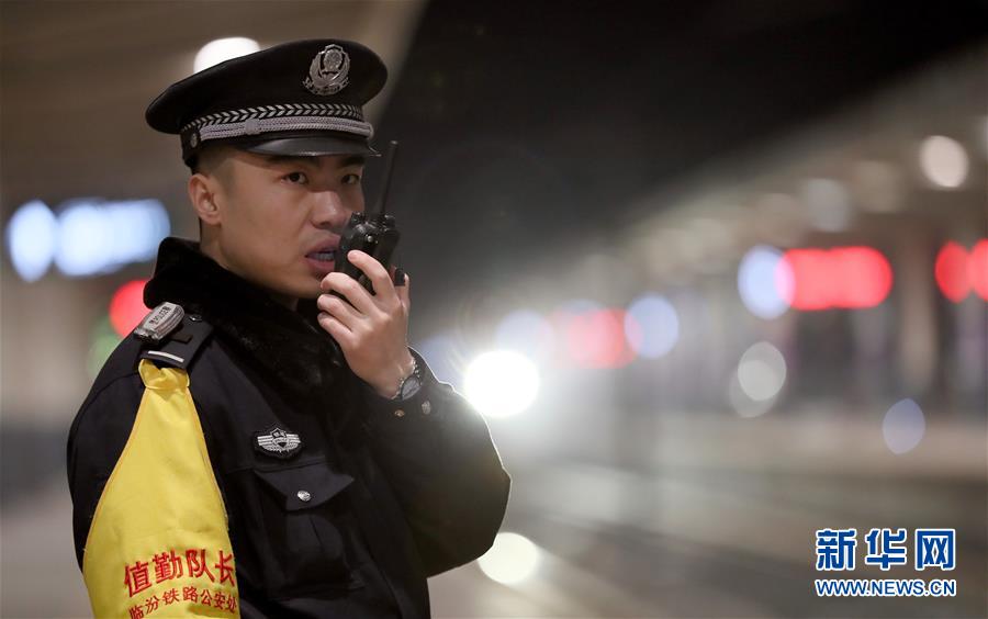 2月4日晚,在山西运城北站,临汾铁路公安处民警张晋杰在站台执勤。 新华社发(鲍东升 摄)