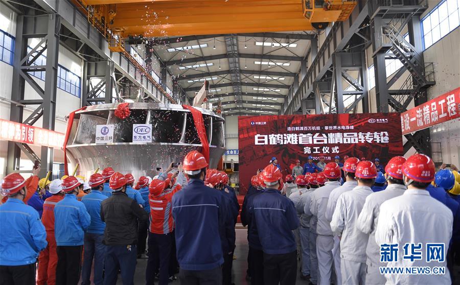 这是白鹤滩水电站首台百万千瓦水轮发电机组的转轮完工仪式现场(1月12日摄)。 新华社记者 刘坤 摄