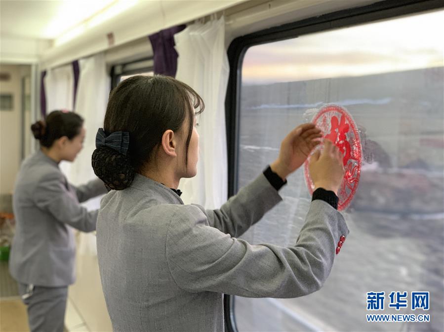 乘务员在列车上贴窗花(2月3日摄)。 新华社记者 王艳刚 摄