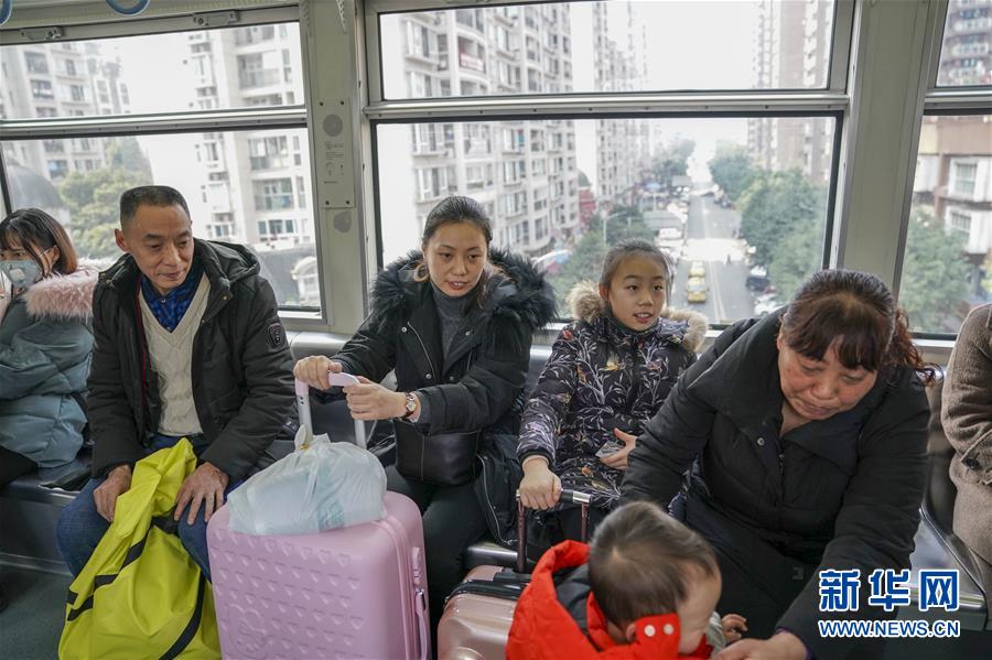 2月3日,岳玲玲(左三)和家人乘坐轻轨列车前往重庆江北国际机场。新华社记者 刘潺 摄