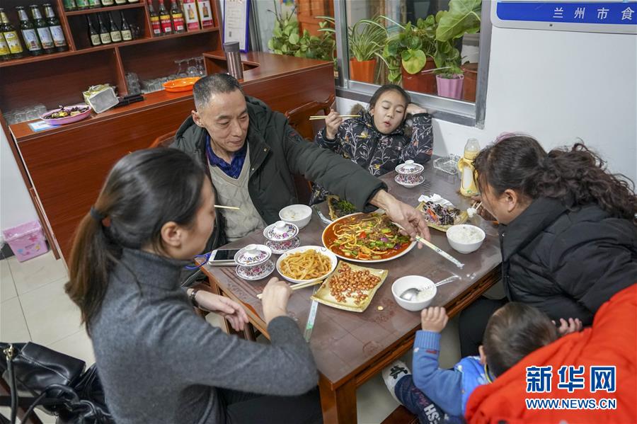 2月3日晚,岳玲玲一家人在兰州的一家餐馆内吃晚饭。 新华社记者 刘潺 摄