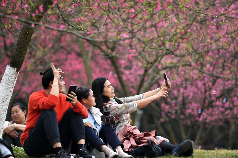 2月5日,游人在南宁市石门森林公园樱花林里自拍。新华社记者 周华 摄