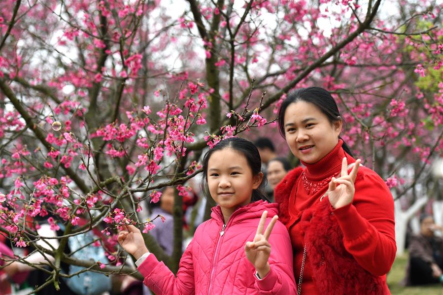 2月5日,游人在南宁市石门森林公园樱花林里留影。 新华社记者 周华 摄