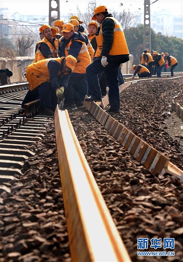 2月5日,中国铁路郑州局集团有限公司郑州桥工段的职工在进行移轨作业。 新华社记者 李安 摄