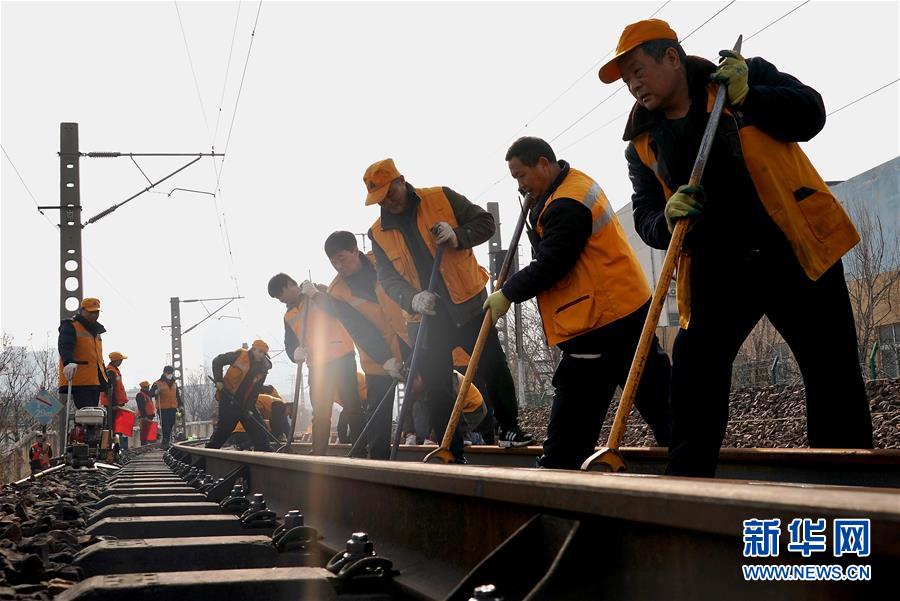 2月5日,中国铁路郑州局集团有限公司郑州桥工段的职工在进行翻轨作业。 新华社记者 李安 摄