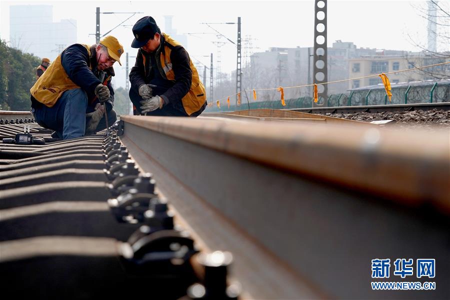 2月5日,中国铁路郑州局集团有限公司郑州桥工段的职工在复紧新更换钢轨的扣件。 新华社记者 李安 摄