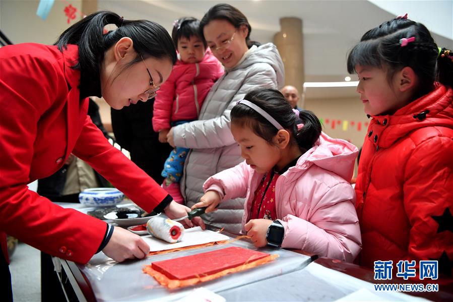 2月6日,小朋友在郑州博物馆体验制作木版年画。新华社记者 李嘉南 摄