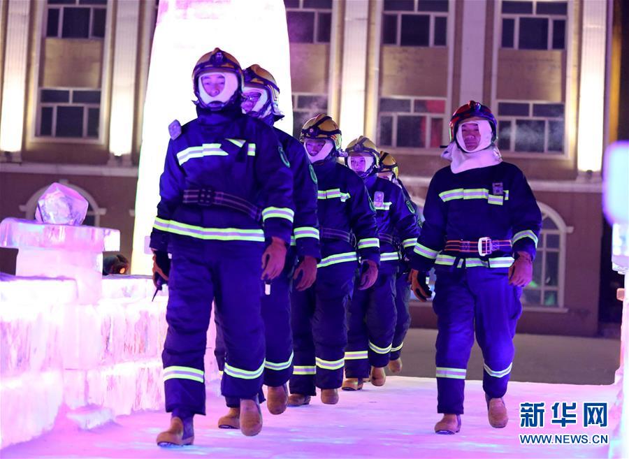 2月5日,黑龙江省漠河市消防救援大队的消防员们在漠河市街头巡查。新华社记者王春雨摄