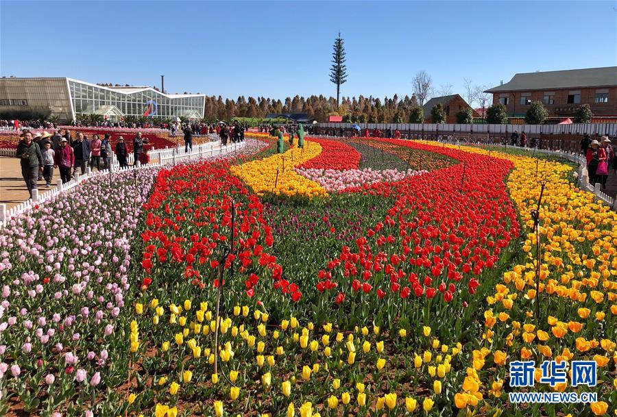 2月6日,游客在云南省昆明市捞鱼河湿地公园游玩。春节期间,捞鱼河湿地公园内50多个品种逾180万株的郁金香竞相绽放。新华社记者 秦晴 摄