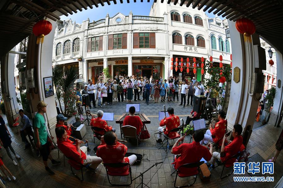 2月6日,游客在海口骑楼老街观看海南八音表演。 新华社记者 郭程 摄
