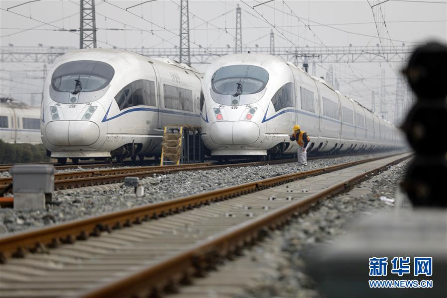 2月6日,在中国铁路西安局集团有限公司西安动车段存车场,机械师在对停放的动车组进行检查。 新华社发(吴瑞西 摄)