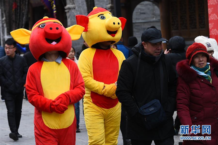 2月8日,由演员装扮的两只“吉祥猪”在山东省潍坊市青州古城景区向游客拜年。 春节假期,人们以多种方式度假休闲,沉浸在节日的欢乐中。 新华社发(王继林 摄)