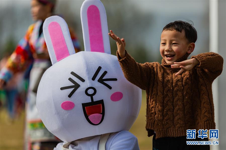 2月8日,在贵州省安顺市一处旅游休闲度假区,一名小朋友和卡通造型人偶合影。 春节假期,人们以多种方式度假休闲,沉浸在节日的欢乐中。 新华社发(陈熙 摄)