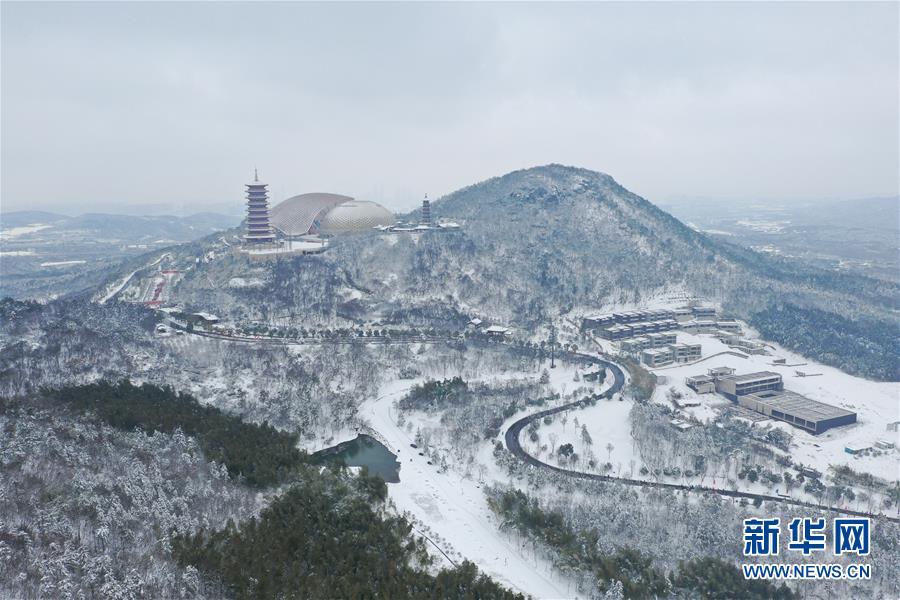 2月8日无人机拍摄的南京牛首山文化旅游区风景。2月7日至8日,江苏南京迎来降雪天气,为新春佳节增添许多趣味。新华社记者 季春鹏 摄