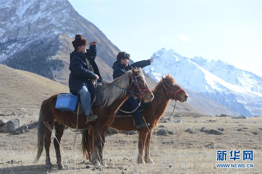 杰恩斯·阿里别克(右)和同事准备前往牧民家中巡诊(1月31日摄)。 新华社发(丁磊 摄)
