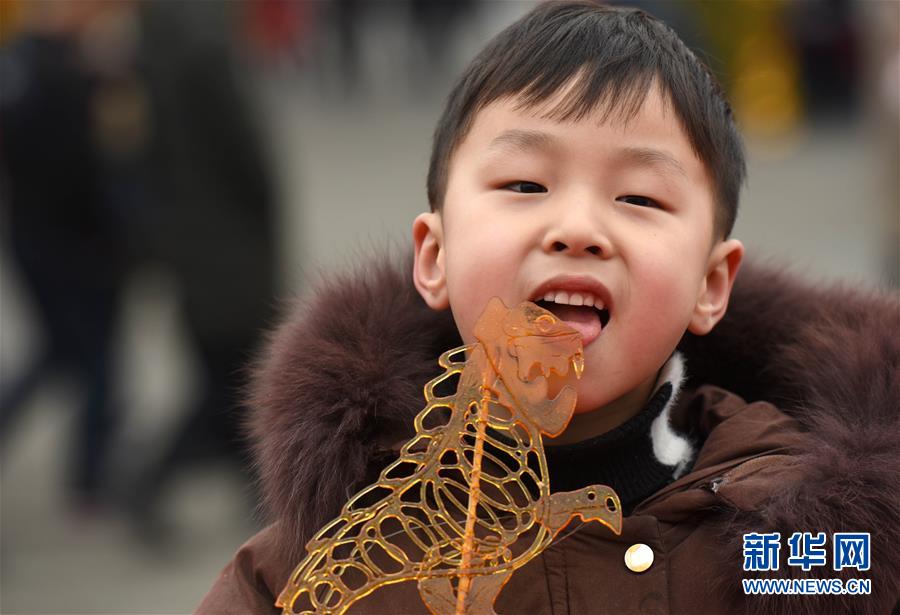 2月8日,游客在淮安清江浦庙会上品尝糖塑。 新华社发(贺敬华 摄)