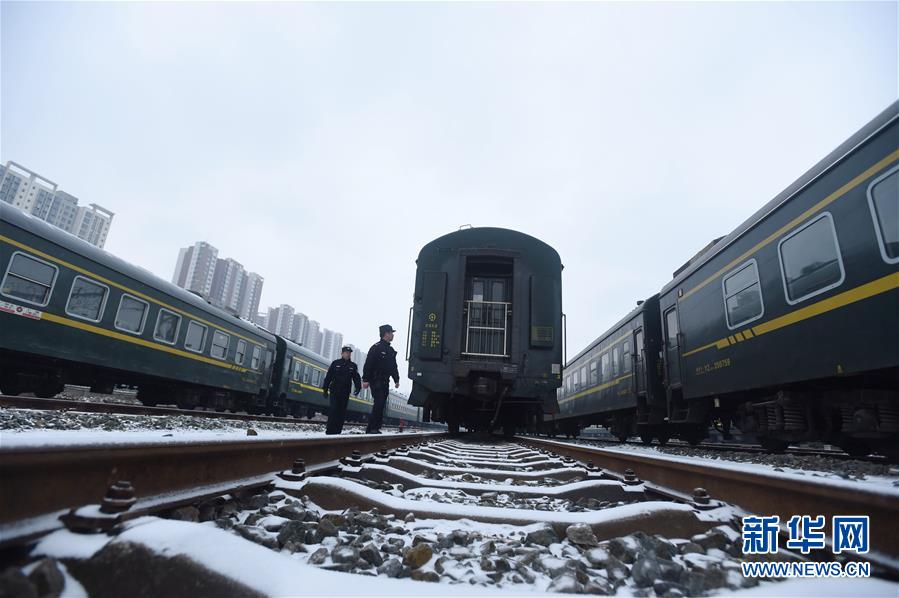 2月8日,武汉铁路公安局襄阳公安处民警对增开旅客列车进行巡查。 新华社发(施勇 摄)